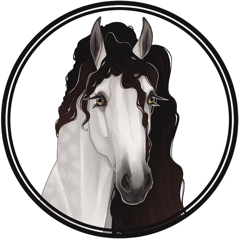 Nyk's favoured form is that of the stallion Fenfaxi, the bog mane, first of the greys. His coat is white; milky & splashed with rosy dapples, his peat coloured tail laden with curls & trailing behind him. He is made of curves from his crested neck to sloping croup, as powerful & agile as any warhorse. A noble head bears large eyes & an expressive mouth, betraying his intelligence if one looks closely enough before he starts talking.